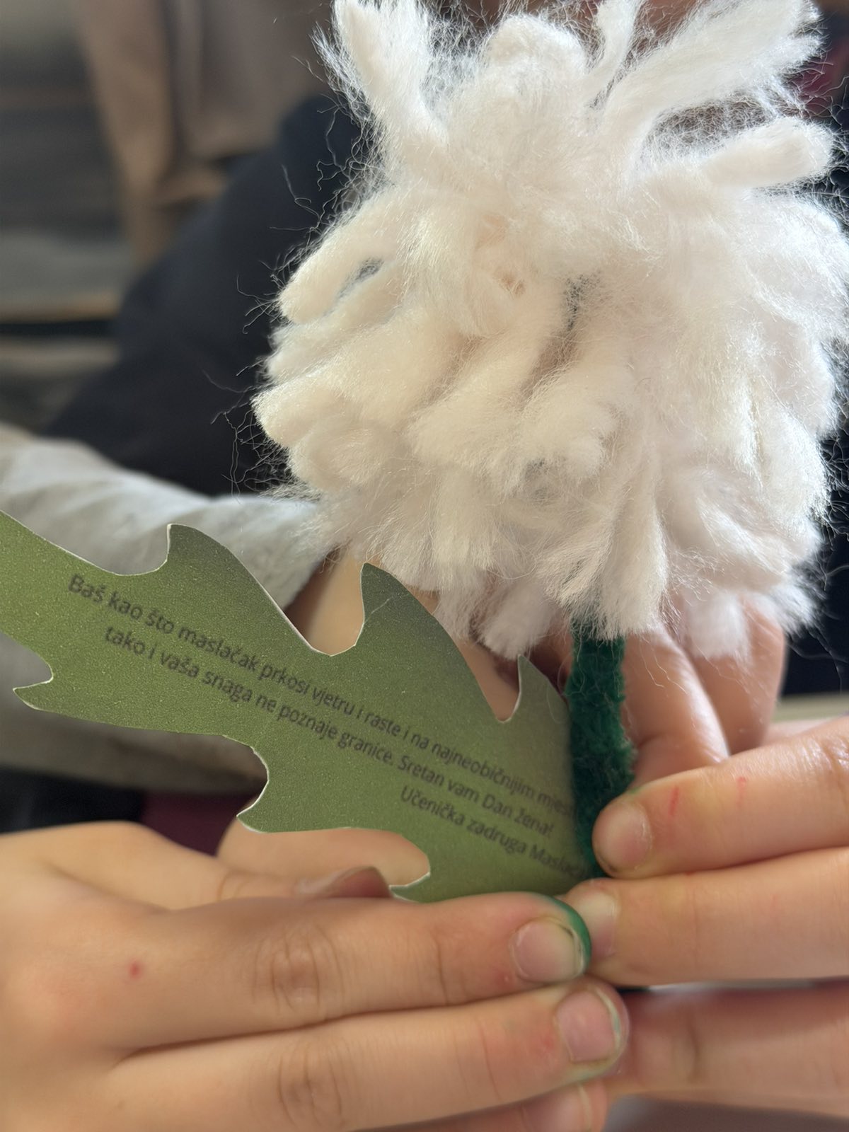 Glavni dar naših učenika bio je ručno izrađeni maslačak, zaštitni znak naše zadruge. Ove posebne cvjetove s puno su pažnje izrađivali učenici 1. i 2. razreda, a svaki je na svom listiću nosio snažnu poruku podrške koja je raznježila djelatnice i korisnice centra: